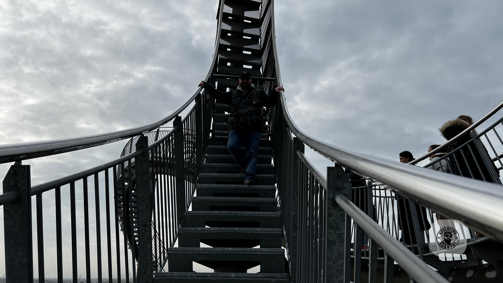Das Wetter? Bedeckt und windig. Kein Postkartenhimmel, aber irgendwie passte es – der graue Himmel ließ das Stahlkonstrukt nur noch stärker wirken, fast wie eine Skulptur gegen den Ruhrpott-Winterhimmel. Und trotz des kühlen Winds war die Stimmung gut. Wir hatten Zeit, wir hatten Neugier, und wir hatten diesen Ort, der gleichzeitig Kunstwerk, Aussichtspunkt und Spielplatz ist.
